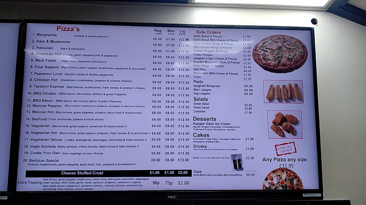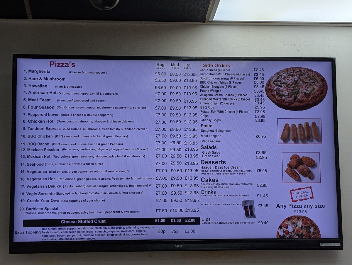 From a reviewer’s perspective, the menu at Barbican Express on Whitecross Street feels thoughtfully put together, offering a well-rounded selection that caters to both classic comfort food lovers and diners looking for lighter options. The pizza range covers all the familiar favourites, from the simplicity of Margherita to more indulgent choices like Ham And Mushroom, Hawaiian, Meat Feast, and Four Season, making it easy to please different tastes at the same table. Pasta dishes such as Spaghetti Bolognese, Vegetable Lasagne, Meat Lasagne, and Chicken And Mushroom Lasagne add depth to the menu, appealing to those who prefer hearty, traditional Italian-style meals. To complement the mains, the side orders - including Spicy Chicken Wings, BBQ Chicken Wings, Chicken Nuggets, Potato Wedges, and Jalapeno Cream Cheese - are ideal for sharing or enhancing a main dish, while the selection of dips like BBQ, Mayonnaise, Sweet & Sour, Garlic & Herbs, and Sweet Chilli allows diners to customise flavours to their liking. For a fresher balance, salads such as Greek Salad, Green Salad, and Tuna Salad provide lighter alternatives. The menu finishes on a strong note with desserts and ice creams, ranging from classic scoops like Belgian Chocolate, Cookies & Cream, Pralines & Cream, Strawberry & Cream, and Strawberry Cheesecake, to richer treats such as Chocolate Fudge Cake, Strawberry Cheesecake, and Tennessee Toffee Pie. Overall, the menu reflects a clear focus on variety, familiarity, and crowd-pleasing dishes, making Barbican Express a reliable choice for casual dining in central London.